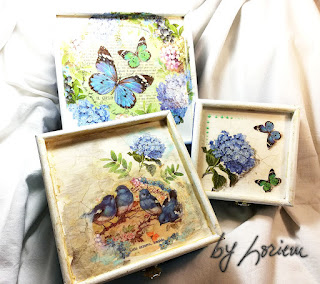 Desi am niste comenzi care vor trebui onorate mai repede si, pentru ca am avut o coala de hirtie de orez care mi s-a lipit de suflet, nu m-am putut abtine sa nu o folosesc in acest sfirsit de saptamina. Astfel, am decorat un set de trei cutii de lemn, cu urmatoarele dimensiuni, de la mare la mic:170x170x75 mm, 140x140x55 mm si 109x109x45 mm.